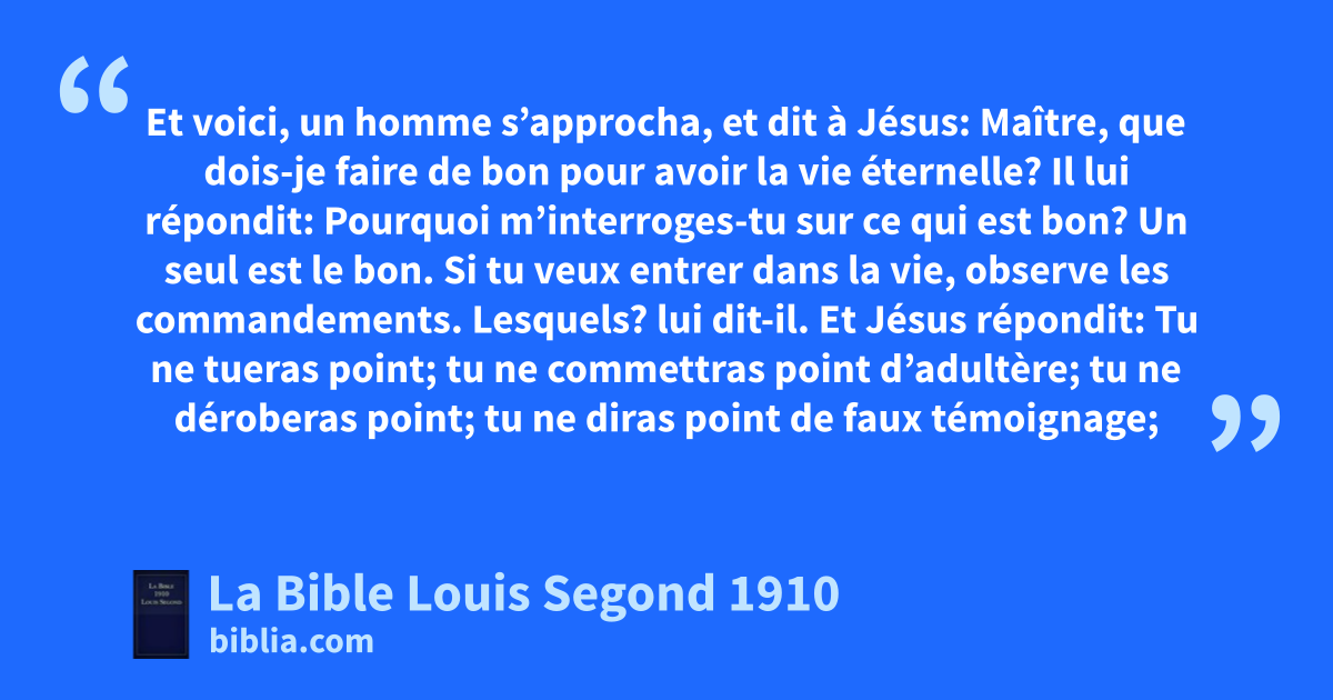 16lEt voici, un homme s’approcha, et dit à Jésus: Maître, que dois-je faire de bon pour avoir la vie éternelle? 17Il lui répondit: Pourquoi m’interroges-tu sur ce qui est bon? Un seul est le bon. Si tu veux entrer dans la vie, observe les commandements. Lesquels? lui dit-il. 18Et Jésus répondit: mTu ne tueras point; tu ne commettras point d’adultère; tu ne déroberas point; tu ne diras point de faux témoignage;