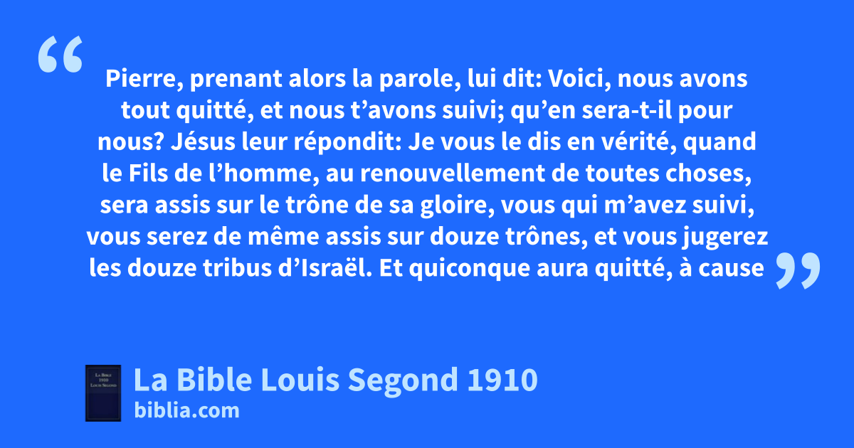 27sPierre, prenant alors la parole, lui dit: Voici, nous avons tout quitté, et nous t’avons suivi; qu’en sera-t-il pour nous? 28Jésus leur répondit: Je vous le dis en vérité, quand le Fils de l’homme, au renouvellement de toutes choses, sera assis sur le trône de sa gloire, vous qui m’avez suivi, tvous serez de même assis sur douze trônes, et vous jugerez les douze tribus d’Israël.