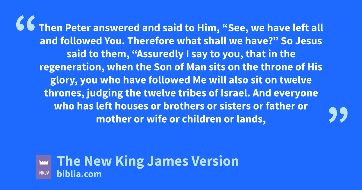 28 So Jesus said to them, “Assuredly I say to you, that in the regeneration, when the Son of Man sits on the throne of His glory, ayou who have followed Me will also sit on twelve thrones, judging the twelve tribes of Israel. 29 bAnd everyone who has left houses or brothers or sisters or father or mother 8or wife or children or 9lands, for My name’s sake, shall receive a hundredfold, and inherit eternal life. 30 cBut many who are first will be last, and the last first.