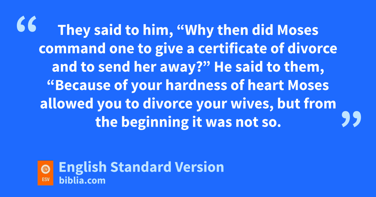 3 And Pharisees came up to him and rtested him by asking, s“Is it lawful to divorce one’s wife for any cause?” 4 He answered, t“Have you not read that he who created them from the beginning made them male and female, 5 and said, u‘Therefore a man shall leave his father and his mother and hold fast to his wife, and vthe two shall become one flesh’? 6 So they are no longer two but one flesh. wWhat therefore God has joined together, let not man separate.” 7 They said to him, x“Why then did Moses command one to give a certificate of divorce and to send her away?” 8 He said to them, “Because of your yhardness of heart Moses allowed you to divorce your wives, but from the beginning it was not so. 9 zAnd I say to you: whoever divorces his wife, except for sexual immorality, and marries another, commits adultery.”1
