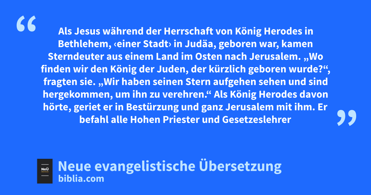 2 1 Als Jesus während der Herrschaft von König Herodes* in Bethlehem2, ‹einer Stadt› in Judäa3, geboren war, kamen Sterndeuter4 aus einem Land im Osten nach Jerusalem. 2 „Wo finden wir den König der Juden, der kürzlich geboren wurde?“, fragten sie. „Wir haben seinen Stern aufgehen sehen und sind hergekommen, um ihn zu verehren.“ 3 Als König Herodes davon hörte, geriet er in Bestürzung und ganz Jerusalem mit ihm. 4 Er befahl alle Hohen Priester5 und Gesetzeslehrer des jüdischen Volkes zu sich und erkundigte sich bei ihnen, wo der Messias geboren werden sollte. 5 „In Bethlehem in Judäa“, erwiderten sie, „denn so steht es im Buch des Propheten:
