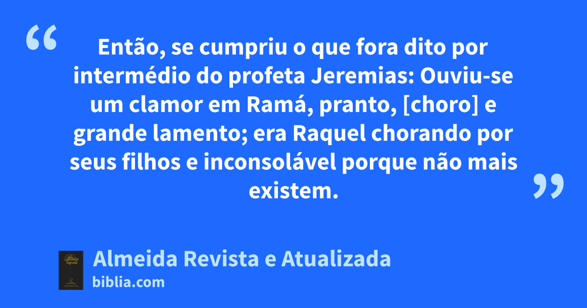 18 Ouviu-se um clamor em Ramá, pranto, [choro] e grande lamento; era Raquel chorando por seus filhos e inconsolável porque não mais existem.c