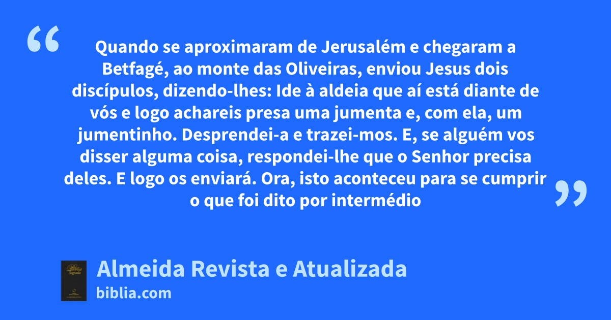 21 1 Quando se aproximaram de Jerusalém e chegaram a Betfagé, ao monte das Oliveiras, enviou Jesus dois discípulos, dizendo-lhes: 2 Ide à aldeia que aí está diante de vós e logo achareis presa uma jumenta e, com ela, um jumentinho. Desprendei-a e trazei-mos. 3 E, se alguém vos disser alguma coisa, respondei-lhe que o Senhor precisa deles. E logo os enviará. 4 Ora, isto aconteceu para se cumprir o que foi dito por intermédio do profeta: