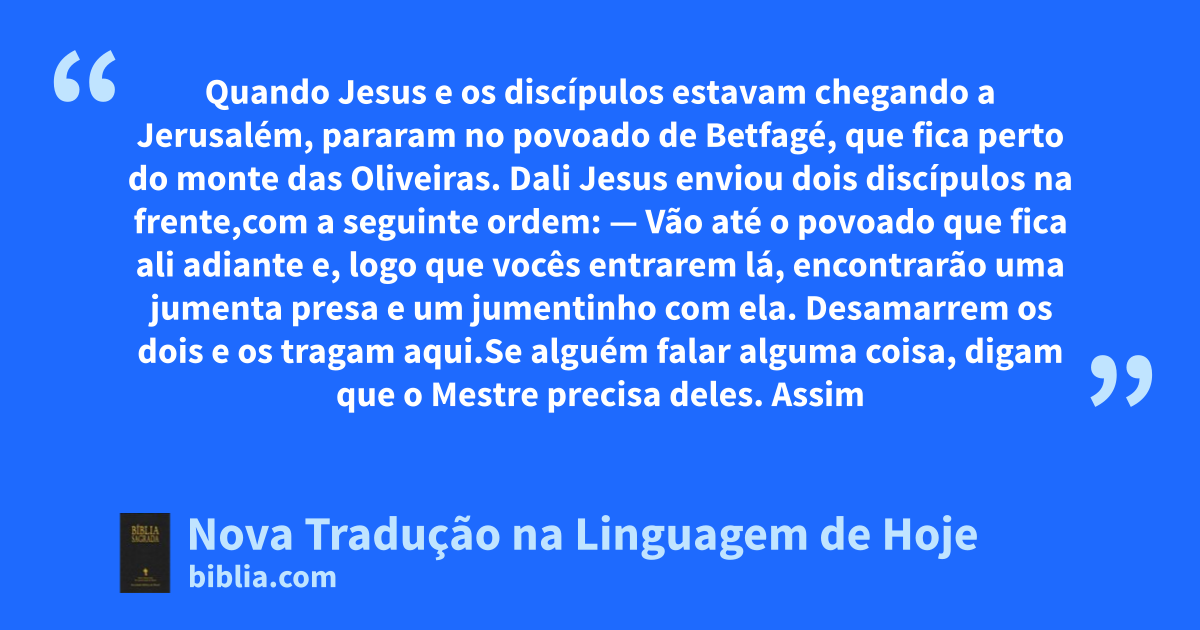 1 Quando Jesus e os discípulos estavam chegando a Jerusalém, pararam no povoado de Betfagé, que fica perto do monte das Oliveiras. Dali Jesus enviou dois discípulos na frente, 2 com a seguinte ordem: