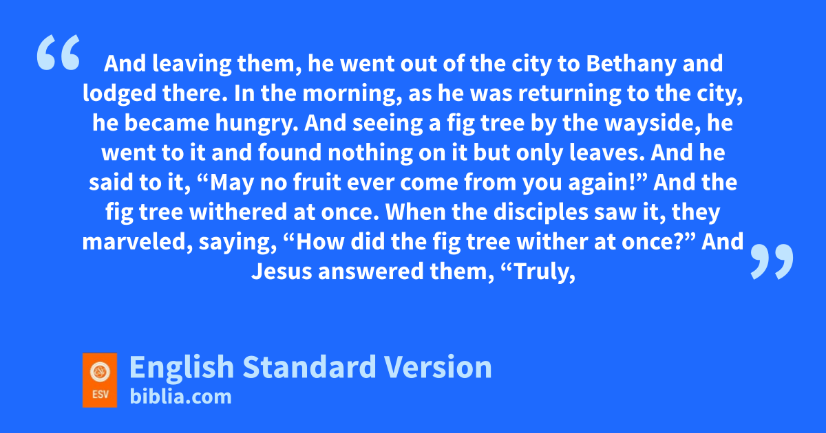 18 rIn the morning, as he was returning to the city, she became hungry. 19 tAnd seeing a fig tree by the wayside, he went to it and found nothing on it but only leaves. And he said to it, “May no fruit ever come from you again!” And the fig tree withered at once.