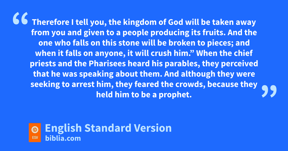 43 Therefore I tell you, the kingdom of God gwill be taken away from you and given to a people hproducing its fruits. 44 And ithe one who falls on this stone will be broken to pieces; and jwhen it falls on anyone, it will crush him.”5