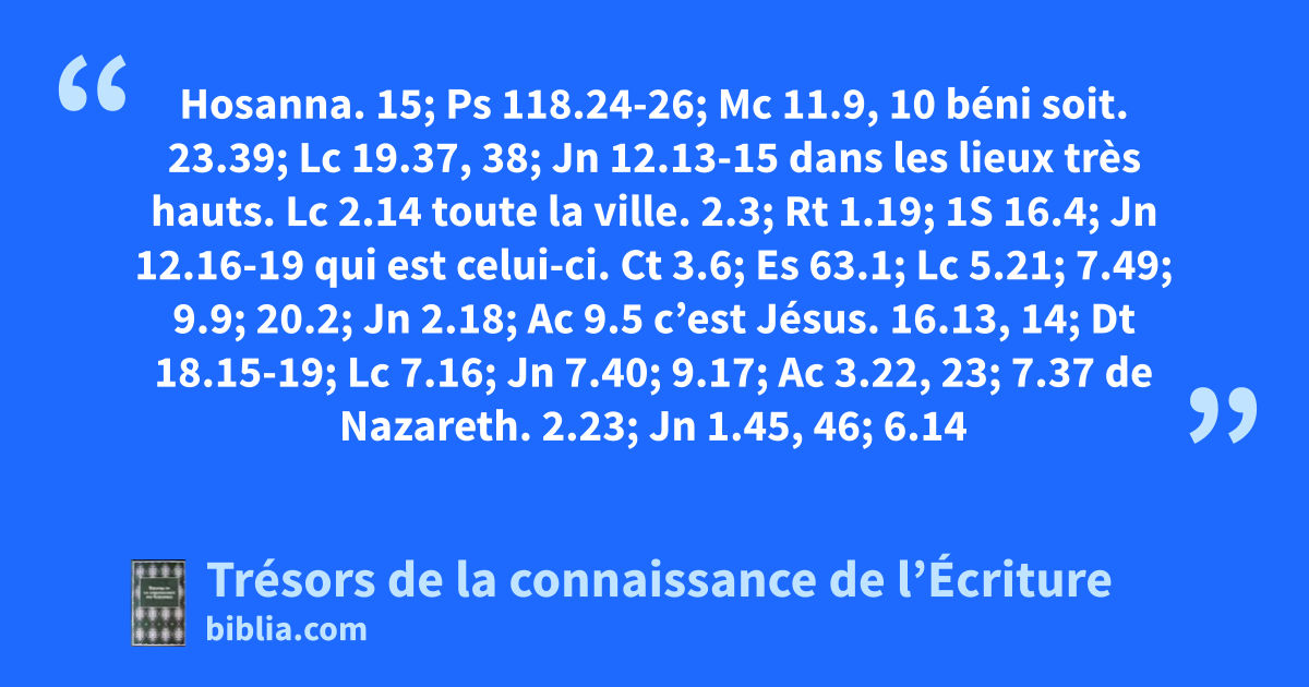 Hosanna. 15; Ps 118.24-26; Mc 11.9, 10 béni soit. 23.39; Lc 19.37, 38; Jn 12.13-15 dans les lieux très hauts. Lc 2.14