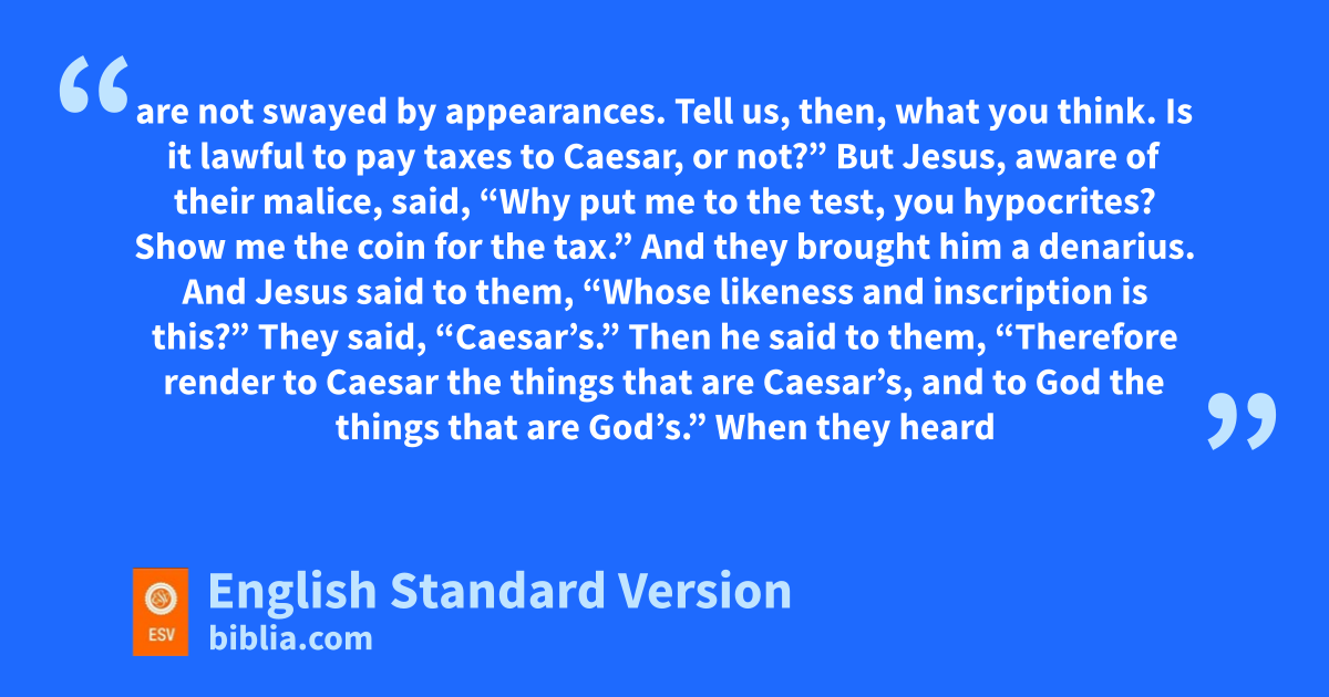 15 gThen the Pharisees went and plotted how hto entangle him in his words. 16 And they sent itheir disciples to him, along with jthe Herodians, saying, “Teacher, kwe know that you are true and teach lthe way of God truthfully, and you do not care about anyone’s opinion, for myou are not swayed by appearances.2 17 Tell us, then, what you think. Is it lawful to pay ntaxes to oCaesar, or not?” 18 But Jesus, aware of their malice, said, “Why pput me to the test, you hypocrites? 19 Show me the coin for the tax.” And they brought him a denarius.3 20 And Jesus said to them, “Whose likeness and inscription is this?” 21 They said, “Caesar’s.” Then he said to them, q“Therefore render to Caesar the things that are Caesar’s, and to God the things that are God’s.” 22 When they heard it, they marveled. And they rleft him and went away.