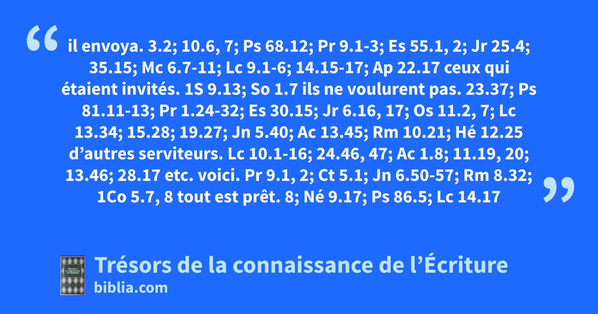 il envoya. 3.2; 10.6, 7; Ps 68.12; Pr 9.1-3; Es 55.1, 2; Jr 25.4; 35.15; Mc 6.7-11; Lc 9.1-6; 14.15-17; Ap 22.17 ceux qui étaient invités. 1S 9.13; So 1.7 ils ne voulurent pas. 23.37; Ps 81.11-13; Pr 1.24-32; Es 30.15; Jr 6.16, 17; Os 11.2, 7; Lc 13.34; 15.28; 19.27; Jn 5.40; Ac 13.45; Rm 10.21; Hé 12.25