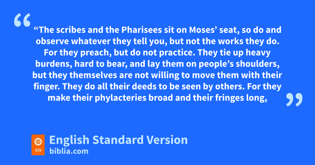 23 Then Jesus tsaid to the crowds and to his disciples, 2 u“The scribes and the Pharisees vsit on Moses’ seat, 3 so do and observe whatever they tell you, wbut not the works they do. xFor they preach, but do not practice. 4 yThey tie up heavy burdens, hard to bear,1 and lay them on people’s shoulders, but they themselves are not willing to move them with their finger. 5 tThey do all their deeds zto be seen by others. For they make atheir phylacteries broad and btheir fringes long, 6 and they clove the place of honor at feasts and dthe best seats in the synagogues 7 and dgreetings in ethe marketplaces and being called frabbi2 by others. 8 gBut you are not to be called rabbi, for you have one teacher, and you are hall brothers.3 9 iAnd call no man your father on earth, for jyou have one Father, who is in heaven. 10 Neither be called instructors, for you have one instructor, kthe Christ. 11 lThe greatest among you shall be your servant. 12 mWhoever exalts himself will be humbled, and whoever humbles himself will be exalted.