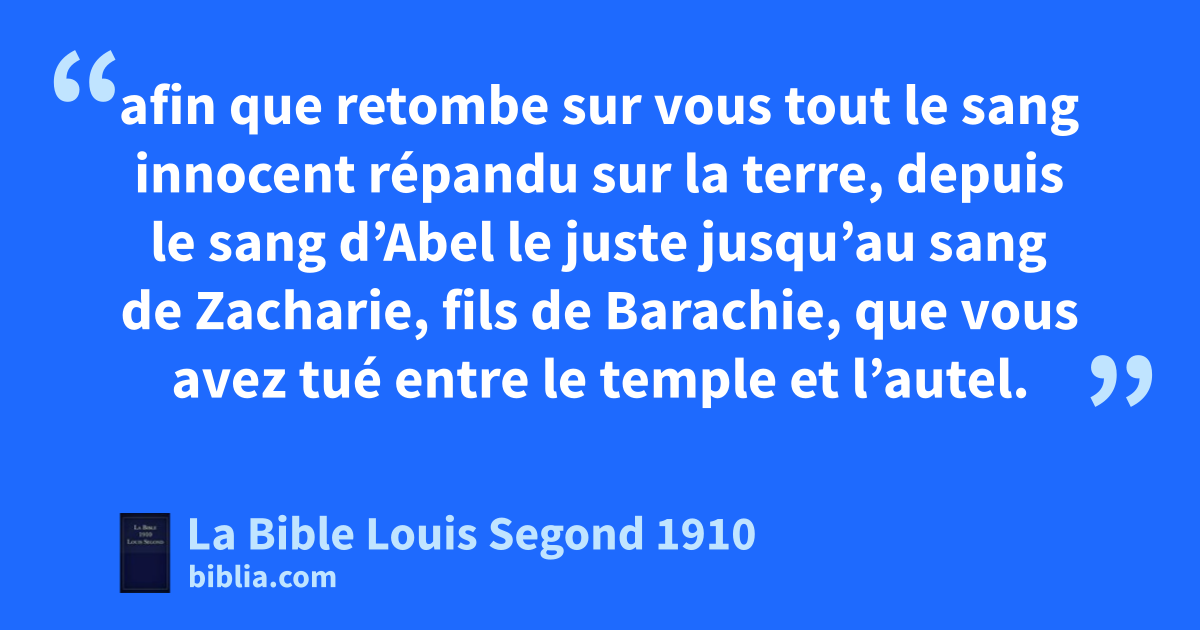 13lMalheur à vous, scribes et pharisiens hypocrites! parce que vous fermez aux hommes le royaume des cieux; vous n’y entrez pas vous-mêmes, et vous n’y laissez pas entrer ceux qui veulent entrer. 14mMalheur à vous, scribes et pharisiens hypocrites! parce que vous dévorez les maisons des veuves, et que vous faites pour l’apparence de longues prières; à cause de cela, vous serez jugés plus sévèrement. 15Malheur à vous, scribes et pharisiens hypocrites! parce que vous courez la mer et la terre pour faire un prosélyte; et, quand il l’est devenu, vous en faites un fils de la géhenne deux fois plus que vous. 16Malheur à vous, conducteurs aveugles! qui dites: Si quelqu’un jure par le temple, ce n’est rien; mais, si quelqu’un jure par l’or du temple, il est engagé. 17Insensés et aveugles! lequel est le plus grand, l’or, ou le temple qui sanctifie l’or? 18Si quelqu’un, dites-vous encore, jure par l’autel, ce n’est rien; mais, si quelqu’un jure par l’offrande qui est sur l’autel, il est engagé. 19Aveugles! lequel est le plus grand, l’offrande, ou nl’autel qui sanctifie l’offrande? 20Celui qui jure par l’autel jure par l’autel et par tout ce qui est dessus; 21ocelui qui jure par le temple jure par le temple et par celui qui l’habite; 22pet celui qui jure par le ciel jure par le trône de Dieu et par celui qui y est assis. 23qMalheur à vous, scribes et pharisiens hypocrites! parce que vous payez la dîme de la menthe, de l’aneth et du cumin, ret que vous laissez ce qui est plus important dans la loi, la justice, la miséricorde et la fidélité: sc’est là ce qu’il fallait pratiquer, sans négliger les autres choses. 24Conducteurs aveugles! qui coulez le moucheron, et qui avalez le chameau. 25tMalheur à vous, scribes et pharisiens hypocrites! parce que vous nettoyez le dehors de la coupe et du plat, et qu’au dedans ils sont pleins de rapine et d’intempérance. 26Pharisien aveugle! nettoie premièrement ul’intérieur de la coupe et du plat, afin que l’extérieur aussi devienne net. 27Malheur à vous, scribes et pharisiens hypocrites! parce que vous ressemblez àv des sépulcres blanchis, qui paraissent beaux au dehors, et qui, au dedans, sont pleins d’ossements de morts et de toute espèce d’impuretés. 28Vous de même, au dehors, vous paraissez justes aux hommes, mais, au dedans, vous êtes pleins d’hypocrisie et d’iniquité. 29wMalheur à vous, scribes et pharisiens hypocrites! parce que vous bâtissez les tombeaux des prophètes et ornez les sépulcres des justes, 30et que vous dites: Si nous avions vécu du temps de nos pères, nous ne nous serions pas joints à eux pour répandre le sang des prophètes. 31Vous témoignez ainsi contre vous-mêmes xque vous êtes les fils de ceux qui ont tué les prophètes. 32Comblez donc la mesure de vos pères. 33ySerpents, race de vipères! comment échapperez-vous au châtiment de la géhenne? 34zC’est pourquoi, voici, aje vous envoie des prophètes, des sages et des scribes. Vous tuerez et crucifierez les uns, bvous battrez de verges les autres dans vos synagogues, et vous les persécuterez de ville en ville, 35afin que retombe sur vous tout le sang innocent répandu sur la terre, cdepuis le sang d’Abel le juste jusqu’au dsang de Zacharie, fils de Barachie, que vous avez tué entre le temple et l’autel. 36Je vous le dis en vérité, tout cela retombera sur cette génération.