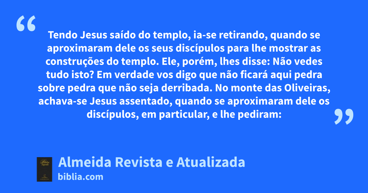 24 1 Tendo Jesus saído do templo, ia-se retirando, quando se aproximaram dele os seus discípulos para lhe mostrar as construções do templo. 2 Ele, porém, lhes disse: Não vedes tudo isto? Em verdade vos digo que não ficará aqui pedra sobre pedra que não seja derribada.