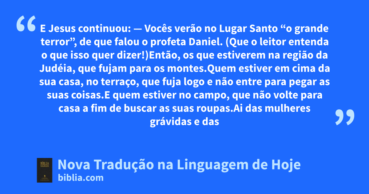 — Vocês verão no * Lugar Santo “o grande terror”, de que falou o * profeta Daniel. (Que o leitor entenda o que isso quer dizer!) 187 16 Então, os que estiverem na região da Judéia, que fujam para os montes.17 Quem estiver em cima da sua casa, no terraço, que fuja logo e não entre para pegar as suas coisas.18 E quem estiver no campo, que não volte para casa a fim de buscar as suas roupas.188 19 Ai das mulheres grávidas e das mães com criancinhas naqueles dias!20 Orem a Deus para que vocês não tenham de fugir no inverno ou no sábadou .21 Porque naqueles dias haverá um sofrimento tão grande como nunca houve desde que Deus criou o mundo; e nunca mais acontecerá uma coisa igual.189 22 Porém Deus diminuiu esse tempo de sofrimento. Se não fosse assim, ninguém seria salvo. Mas, por causa do povo que Deus escolheu para salvar, esse tempo será diminuído.