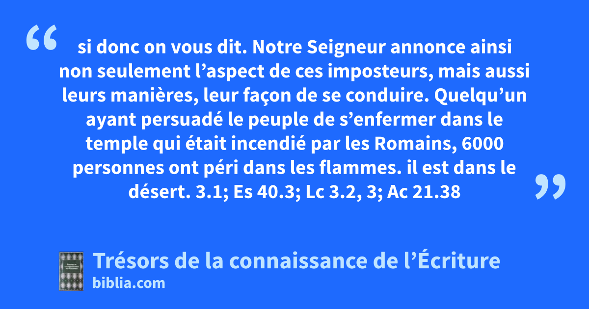 si donc on vous dit. Notre Seigneur annonce ainsi non seulement l’aspect de ces imposteurs, mais aussi leurs manières, leur façon de se conduire. Quelqu’un ayant persuadé le peuple de s’enfermer dans le temple qui était incendié par les Romains, 6000 personnes ont péri dans les flammes. il est dans le désert. 3.1; Es 40.3; Lc 3.2, 3; Ac 21.38