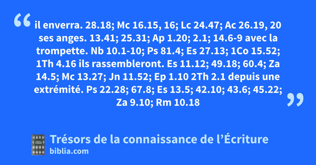 il enverra. 28.18; Mc 16.15, 16; Lc 24.47; Ac 26.19, 20 ses anges. 13.41; 25.31; Ap 1.20; 2.1; 14.6-9 avec la trompette. Nb 10.1-10; Ps 81.4; Es 27.13; 1Co 15.52; 1Th 4.16 ils rassembleront. Es 11.12; 49.18; 60.4; Za 14.5; Mc 13.27; Jn 11.52; Ep 1.10 2Th 2.1 depuis une extrémité. Ps 22.28; 67.8; Es 13.5; 42.10; 43.6; 45.22; Za 9.10; Rm 10.18