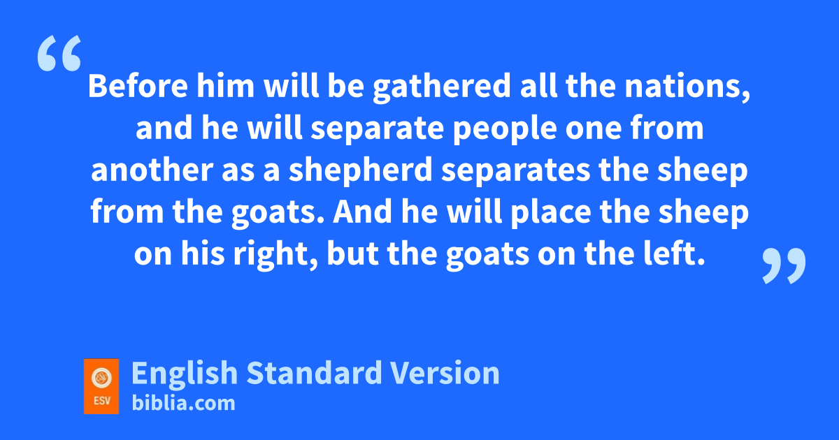 31 i“When the Son of Man comes in his glory, and all the angels with him, jthen he will sit on his glorious throne. 32 Before him kwill be gathered lall the nations, and mhe will separate people one from another as a shepherd separates nthe sheep from the goats. 33 And he will place the sheep on his right, but the goats on the left. 34 Then othe King will say to pthose on his right, ‘Come, you qwho are blessed by my Father, rinherit sthe kingdom tprepared for you ufrom the foundation of the world. 35 For vI was hungry and you gave me food, I was thirsty and you wgave me drink, xI was a stranger and you welcomed me, 36 vI was naked and you clothed me, yI was sick and you zvisited me, aI was in prison and you came to me.’ 37 Then the righteous will answer him, saying, ‘Lord, when did we see you hungry and feed you, or thirsty and give you drink? 38 And when did we see you a stranger and welcome you, or naked and clothe you? 39 And when did we see you sick or in prison and visit you?’ 40 And bthe King will answer them, c‘Truly, I say to you, as you did it to one of the least of these dmy brothers,6 you did it to me.’