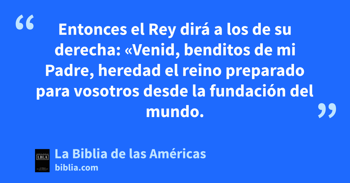 34 Entonces el Rey dirá a los de su derecha: «Venid, benditos de mi Padre, heredad el reino preparado para vosotrosa desde la fundación del mundob.