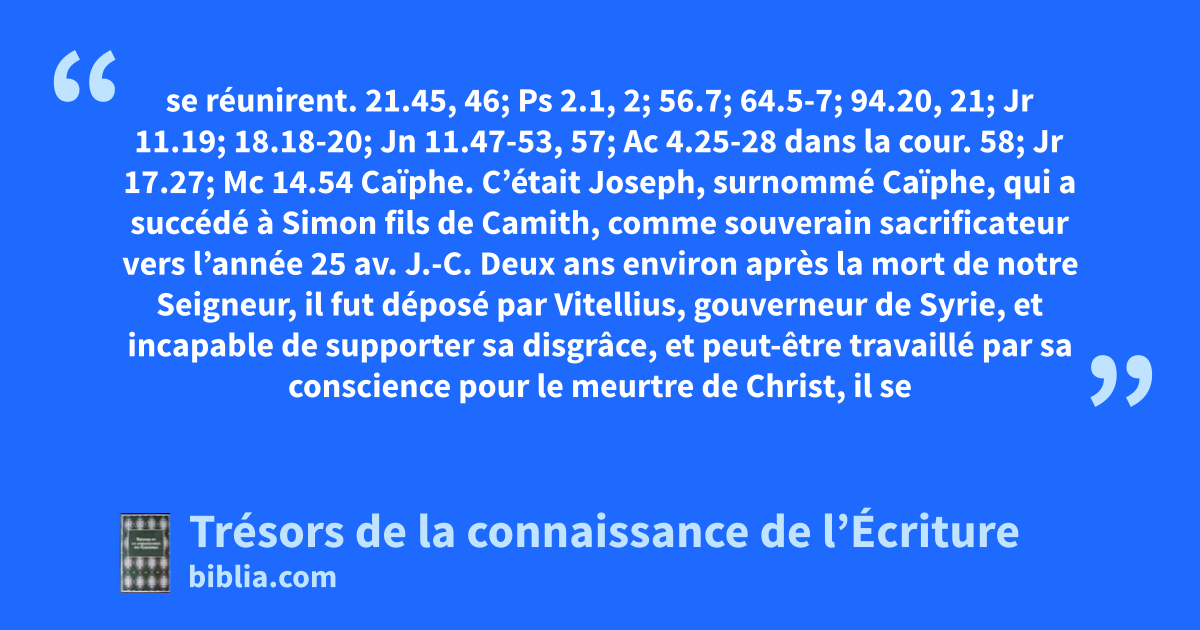 se réunirent. 21.45, 46; Ps 2.1, 2; 56.7; 64.5-7; 94.20, 21; Jr 11.19; 18.18-20; Jn 11.47-53, 57; Ac 4.25-28 dans la cour. 58; Jr 17.27; Mc 14.54 Caïphe. C’était Joseph, surnommé Caïphe, qui a succédé à Simon fils de Camith, comme souverain sacrificateur vers l’année 25 av. J.-C. Deux ans environ après la mort de notre Seigneur, il fut déposé par Vitellius, gouverneur de Syrie, et incapable de supporter sa disgrâce, et peut-être travaillé par sa conscience pour le meurtre de Christ, il se suicida vers l’année 35. Jn 11.49; 18.13, 14, 24; Ac 4.5, 6