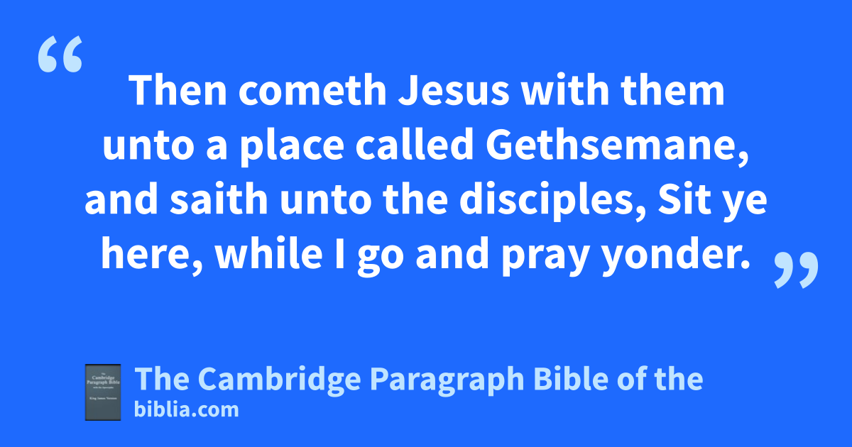 36 gThen cometh Jesus with them unto a place called hGethsemane, and saith unto the disciples, Sit ye here, while I go and pray yonder. 37 And he took with him Peter and ithe two sons of Zebedee, and began to be sorrowful and jvery heavy. 38 Then saith he unto them, kMy soul is exceeding sorrowful, even unto death: tarry ye here, and lwatch with me. 39 And he went a little further, and fell on his face, and mprayed, saying, nO my Father, if it be possible, let this ocup pass from me: nevertheless pnot as I will, qbut as thou wilt. 40 And rhe cometh unto the disciples, and findeth them asleep, and saith unto Peter, sWhat, could ye not lwatch with me one hour? 41 tWatch and pray, that ye enter not into temptation: uthe spirit indeed is willing, but the flesh is weak. 42 He went away again the second time, and prayed, saying, O my Father, pif this ocup may not pass away from me, except I drink it, qthy will be done. 43 And he came and found them asleep again: for their eyes were xheavy. 44 And he left them, and went away again, and prayed the third time, saying the same words. 45 Then cometh he to his disciples, and saith unto them, Sleep on ynow, and take your rest: behold, zthe hour is at hand, and the Son of man is betrayed into the hands of sinners. 46 Rise, let us be going: behold, he is at hand that doth betray me.