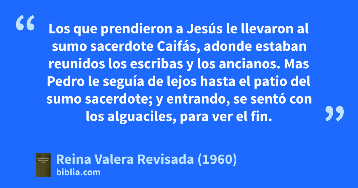 57Los que prendieron a Jesús le llevaron al sumo sacerdote Caifás, adonde estaban reunidos los escribas y los ancianos. 58Mas Pedro le seguía de lejos hasta el patio del sumo sacerdote; y entrando, se sentó con los alguaciles, para ver el fin. 59Y los principales sacerdotes y los ancianos y todo el concilio, buscaban falso testimonio contra Jesús, para entregarle a la muerte, 60y no lo hallaron, aunque muchos testigos falsos se presentaban. Pero al fin vinieron dos testigos falsos, 61que dijeron: Este dijo: Puedo derribar el templo de Dios, y en tres días reedificarlo.j 62Y levantándose el sumo sacerdote, le dijo: ¿No respondes nada? ¿Qué testifican éstos contra ti? 63Mas Jesús callaba. Entonces el sumo sacerdote le dijo: Te conjuro por el Dios viviente, que nos digas si eres tú el Cristo, el Hijo de Dios. 64Jesús le dijo: Tú lo has dicho; y además os digo, que desde ahora veréis al Hijo del Hombre sentado a la diestra del poder de Dios, y viniendo en las nubes del cielo.k 65Entonces el sumo sacerdote rasgó sus vestiduras, diciendo: ¡Ha blasfemado! ¿Qué más necesidad tenemos de testigos? He aquí, ahora mismo habéis oído su blasfemia. 66¿Qué os parece? Y respondiendo ellos, dijeron: ¡Es reo de muerte!l 67Entonces le escupieron en el rostro, y le dieron de puñetazos, y otros le abofeteaban,m 68diciendo: Profetízanos, Cristo, quién es el que te golpeó.