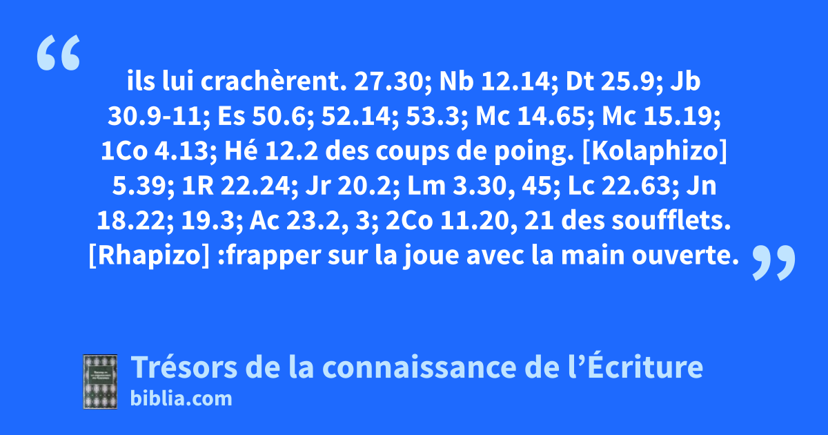 ils lui crachèrent. 27.30; Nb 12.14; Dt 25.9; Jb 30.9-11; Es 50.6; 52.14; 53.3; Mc 14.65; Mc 15.19; 1Co 4.13; Hé 12.2 des coups de poing. [Kolaphizo] 5.39; 1R 22.24; Jr 20.2; Lm 3.30, 45; Lc 22.63; Jn 18.22; 19.3; Ac 23.2, 3; 2Co 11.20, 21 des soufflets. [Rhapizo] :frapper sur la joue avec la main ouverte.