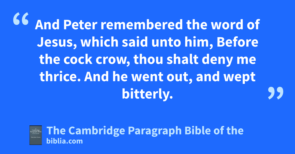 69 tNow Peter sat without in the upalace: and a damsel came unto him, saying, Thou also wast with Jesus of vGalilee. 70 But he denied before them all, saying, I know not what thou sayest. 71 And when he was gone out into wthe porch, xanother maid saw him, and said unto them that were there, This fellow was also with Jesus of vNazareth. 72 And again he denied with an oath, I do not know the man. 73 And yafter a while came unto him zthey that stood by, and said to Peter, Surely thou also art one of them; for athy speech bbewrayeth thee. 74 Then began he to curse and to swear, saying, I know not the man. And immediately the cock crew. 75 And Peter cremembered the word of Jesus, which said unto him, dBefore the cock crow, thou shalt deny me thrice. And he went out, and wept bitterly.