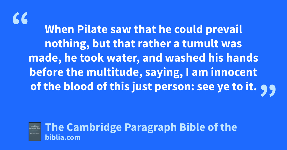 15 uNow at that feast the governor was wont to release unto the people xa prisoner, whom they would. 16 And they had then a ynotable prisoner, called Barabbas. 17 Therefore when they were gathered together, Pilate said unto them, Whom will ye that I release unto you? Barabbas, or Jesus which is called Christ? 18 For he knew that for envy they had delivered him. 19 When he was set down on zthe judgment seat, his wife sent unto him, saying, aHave thou nothing to do with that just man: for I have suffered many things this day bin a dream because of him. 20 But the chief priests and elders persuaded the multitude cthat they should ask Barabbas, and destroy Jesus. 21 The governor answered and said unto them, Whether of the twain will ye that I release unto you? They said, Barabbas. 22 Pilate saith unto them, What shall I do then with Jesus which is called Christ? They all say unto him, Let him be crucified. 23 And the governor said, Why, what evil hath he done? But they cried out the more, saying, Let him be crucified. 24 When Pilate saw that he could prevail nothing, but that rather da tumult was made, he etook water, and washed his hands before the multitude, saying, I am finnocent of the blood of this just person: see ye to it. 25 Then answered all the people, and said, gHis blood be on us, and on our children. 26 Then released he Barabbas unto them: and when he had hscourged Jesus, he delivered him to be crucified.