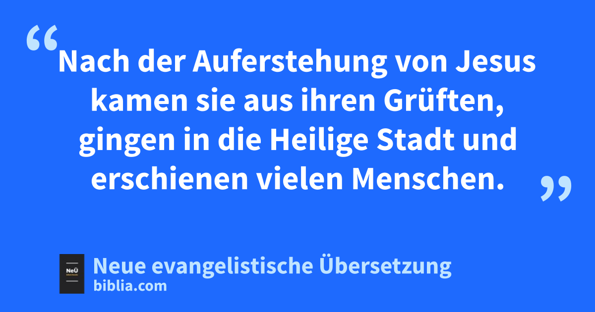 45 Aber von Mittag an und noch den halben Nachmittag6 lag eine schwere Finsternis über dem ganzen Land. 46 Zuletzt7 schrie Jesus laut: „Eli, Eli, lema sabachthani?“ Das heißt: „Mein Gott, mein Gott, warum hast du mich verlassen?“ 47 Einige der Herumstehenden hörten das und sagten: „Seht, er ruft Elija!“ 48 Einer von ihnen holte schnell einen Schwamm, tauchte ihn in sauren Wein, steckte ihn auf einen Stock und hielt ihn Jesus zum Trinken hin. 49 „Wartet!“, riefen die anderen, „wir wollen doch sehen, ob Elija kommt, um ihn zu retten.“ 50 Jesus aber schrie noch einmal laut auf und übergab den Geist. 51 In diesem Augenblick riss der Vorhang im Tempel von oben bis unten entzwei. Die Erde fing an zu beben, Felsen rissen auf 52 und Grüfte öffneten sich. Viele verstorbene Heilige wurden auferweckt. 53 Nach der Auferstehung von Jesus kamen sie aus ihren Grüften, gingen in die Heilige Stadt und erschienen vielen Menschen.