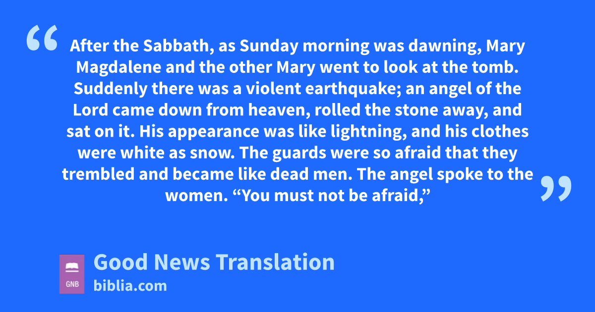 28 After the Sabbath, as Sunday morning was dawning, Mary Magdalene and the other Mary went to look at the tomb. 2Suddenly there was a violent earthquake; an angel of the Lord came down from heaven, rolled the stone away, and sat on it. 3His appearance was like lightning, and his clothes were white as snow. 4The guards were so afraid that they trembled and became like dead men.