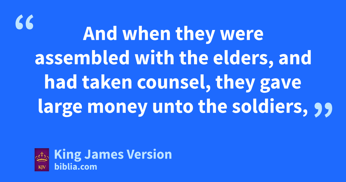 11 Now when they were going, behold, some of tthe watch came into the city, and shewed unto the chief priests all the things that were done. 12 And when they were assembled with the elders, and had utaken counsel, they gave large money unto the soldiers, 13 Saying, Say ye, His disciples came by night, and stole him away while we slept. 14 And if this come to the wgovernor’s ears, we will xpersuade him, and secure you. 15 So they took the money, and did as they were taught: and this saying is ycommonly reported among the Jews zuntil this day.