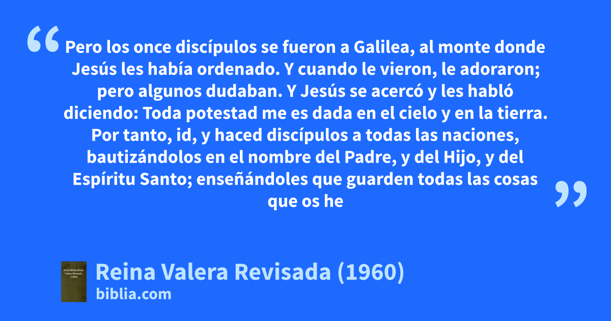 16Pero los once discípulos se fueron a Galilea,a al monte donde Jesús les había ordenado. 17Y cuando le vieron, le adoraron; pero algunos dudaban. 18Y Jesús se acercó y les habló diciendo: Toda potestad me es dada en el cielo y en la tierra. 19Por tanto, id, y haced discípulos a todas las naciones,b bautizándolos en el nombre del Padre, y del Hijo, y del Espíritu Santo; 20enseñándoles que guarden todas las cosas que os he mandado; y he aquí yo estoy con vosotros todos los días, hasta el fin del mundo. Amén.