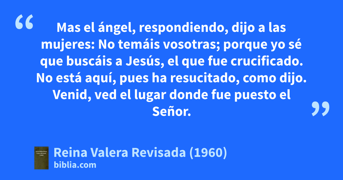 1Pasado el día de reposo,* al amanecer del primer día de la semana, vinieron María Magdalena y la otra María, a ver el sepulcro. 2Y hubo un gran terremoto; porque un ángel del Señor, descendiendo del cielo y llegando, removió la piedra, y se sentó sobre ella. 3Su aspecto era como un relámpago, y su vestido blanco como la nieve. 4Y de miedo de él los guardas temblaron y se quedaron como muertos. 5Mas el ángel, respondiendo, dijo a las mujeres: No temáis vosotras; porque yo sé que buscáis a Jesús, el que fue crucificado. 6No está aquí, pues ha resucitado, como dijo. Venid, ved el lugar donde fue puesto el Señor. 7E id pronto y decid a sus discípulos que ha resucitado de los muertos, y he aquí va delante de vosotros a Galilea; allí le veréis. He aquí, os lo he dicho. 8Entonces ellas, saliendo del sepulcro con temor y gran gozo, fueron corriendo a dar las nuevas a sus discípulos. Y mientras iban a dar las nuevas a los discípulos, 9he aquí, Jesús les salió al encuentro, diciendo: ¡Salve! Y ellas, acercándose, abrazaron sus pies, y le adoraron. 10Entonces Jesús les dijo: No temáis; id, dad las nuevas a mis hermanos, para que vayan a Galilea, y allí me verán.