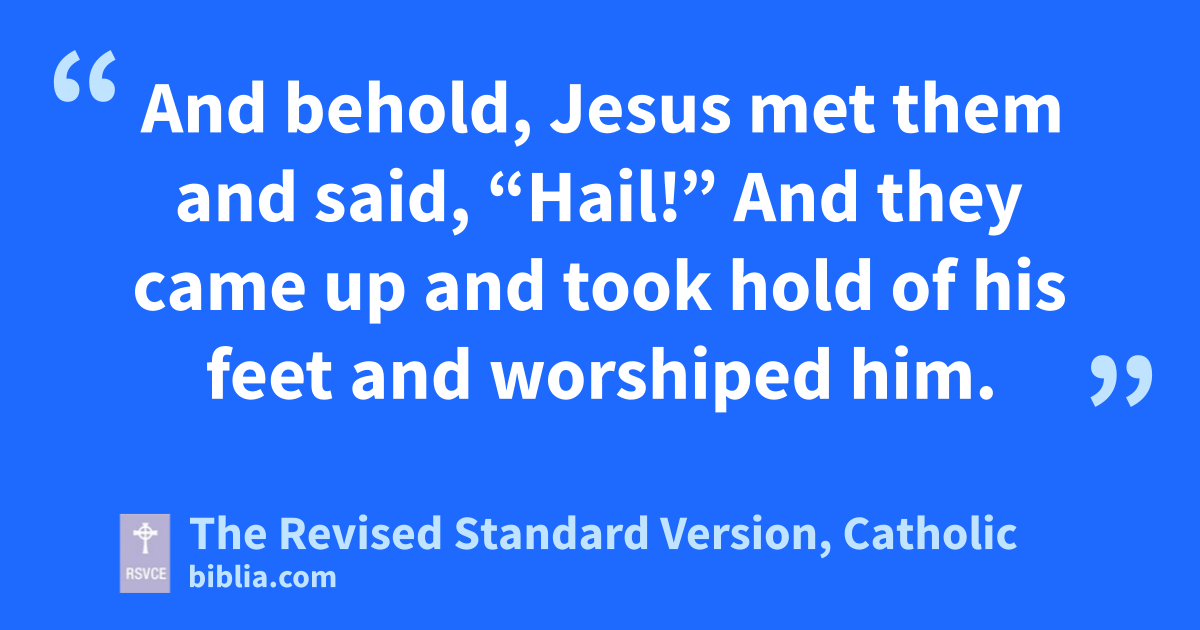 1 Now after the sabbath, toward the dawn of the first day of the week, Mary Magdalene and the other Mary went to see the sepulchre. 2 And behold, there was a great earthquake; for an angel of the Lord descended from heaven and came and rolled back the stone, and sat upon it. 3 His appearance was like lightning, and his raiment white as snow. 4 And for fear of him the guards trembled and became like dead men. 5 But the angel said to the women, “Do not be afraid; for I know that you seek Jesus who was crucified. 6 He is not here; for he has risen, as he said. Come, see the place where he* lay. 7 Then go quickly and tell his disciples that he has risen from the dead, and behold, he is going before you to Galilee; there you will see him. Lo, I have told you.” 8 So they departed quickly from the tomb with fear and great joy, and ran to tell his disciples. 9 And behold, Jesus met them and said, “Hail!” And they came up and took hold of his feet and worshiped him. 10 Then Jesus said to them, “Do not be afraid; go and tell my brethren to go to Galilee, and there they will see me.”