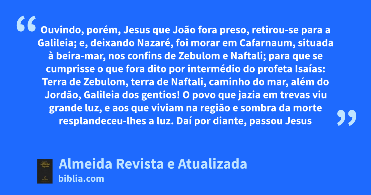 12 Ouvindo, porém, Jesus que Joãog fora preso, retirou-se para a Galileia; 13 e, deixando Nazaré, foi morar em Cafarnaumh, situada à beira-mar, nos confins de Zebulom e Naftali; 14 para que se cumprisse o que fora dito por intermédio do profeta Isaías: