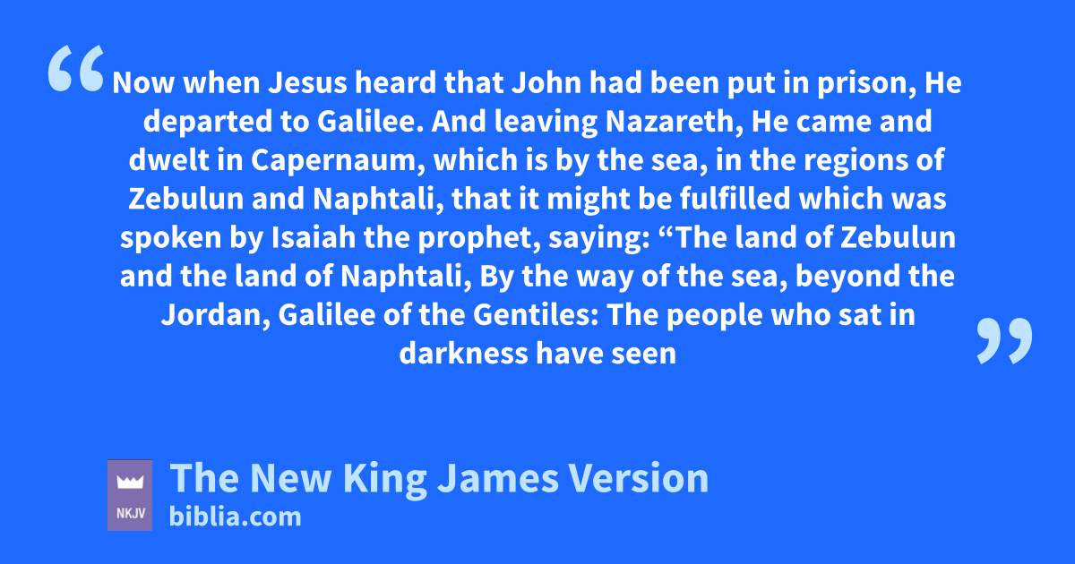 12 lNow when Jesus heard that John had been put in prison, He departed to Galilee. 13 And leaving Nazareth, He came and dwelt in Capernaum, which is by the sea, in the regions of Zebulun and Naphtali, 14 that it might be fulfilled which was spoken by Isaiah the prophet, saying: