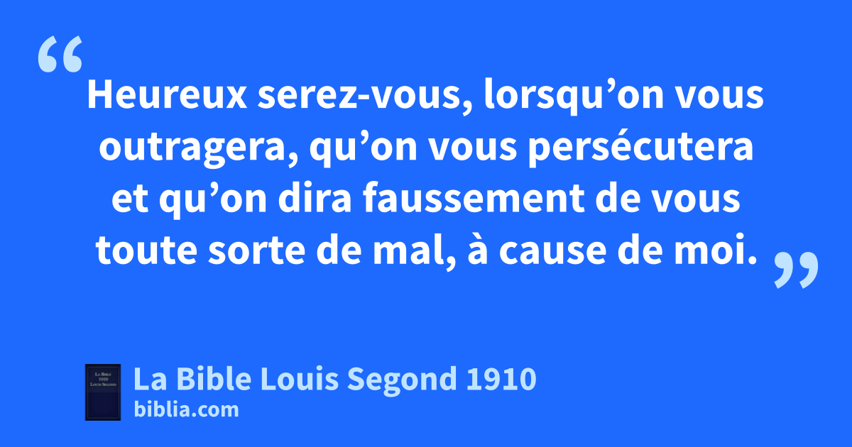 3aHeureux les pauvres en esprit, car le royaume des cieux est à eux! 4bHeureux les affligés, car ils seront consolés! 5cHeureux les débonnaires, car ils hériteront la terre! 6dHeureux ceux qui ont faim et soif de la justice, car ils seront rassasiés! 7Heureux les miséricordieux, car ils obtiendront miséricorde! 8eHeureux ceux qui ont le coeur pur, car ils verront Dieu! 9Heureux ceux qui procurent la paix, car ils seront appelés fils de Dieu! 10fHeureux ceux qui sont persécutés pour la justice, car le royaume des cieux est à eux! 11Heureux serez-vous, lorsqu’on vous outragera, qu’on vous persécutera et qu’on dira faussement de vous toute sorte de mal, gà cause de moi. 12hRéjouissez-vous et soyez dans l’allégresse, parce que votre récompense sera grande dans les cieux; car c’est ainsi qu’on a persécuté les prophètes qui ont été avant vous.
