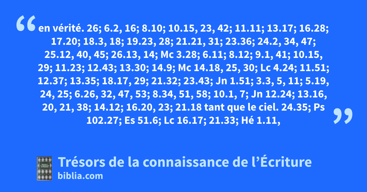en vérité. 26; 6.2, 16; 8.10; 10.15, 23, 42; 11.11; 13.17; 16.28; 17.20; 18.3, 18; 19.23, 28; 21.21, 31; 23.36; 24.2, 34, 47; 25.12, 40, 45; 26.13, 14; Mc 3.28; 6.11; 8.12; 9.1, 41; 10.15, 29; 11.23; 12.43; 13.30; 14.9; Mc 14.18, 25, 30; Lc 4.24; 11.51; 12.37; 13.35; 18.17, 29; 21.32; 23.43; Jn 1.51; 3.3, 5, 11; 5.19, 24, 25; 6.26, 32, 47, 53; 8.34, 51, 58; 10.1, 7; Jn 12.24; 13.16, 20, 21, 38; 14.12; 16.20, 23; 21.18 tant que le ciel. 24.35; Ps 102.27; Es 51.6; Lc 16.17; 21.33; Hé 1.11, 12 2P 3.10-13; Ap 20.11 il ne disparaîtra pas. Ps 119.89, 90, 152; Es 40.8; 1P 1.25