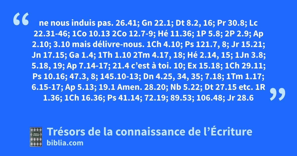 ne nous induis pas. 26.41; Gn 22.1; Dt 8.2, 16; Pr 30.8; Lc 22.31-46; 1Co 10.13 2Co 12.7-9; Hé 11.36; 1P 5.8; 2P 2.9; Ap 2.10; 3.10 mais délivre-nous. 1Ch 4.10; Ps 121.7, 8; Jr 15.21; Jn 17.15; Ga 1.4; 1Th 1.10 2Tm 4.17, 18; Hé 2.14, 15; 1Jn 3.8; 5.18, 19; Ap 7.14-17; 21.4 c’est à toi. 10; Ex 15.18; 1Ch 29.11; Ps 10.16; 47.3, 8; 145.10-13; Dn 4.25, 34, 35; 7.18; 1Tm 1.17; 6.15-17; Ap 5.13; 19.1 Amen. 28.20; Nb 5.22; Dt 27.15 etc. 1R 1.36; 1Ch 16.36; Ps 41.14; 72.19; 89.53; 106.48; Jr 28.6 1Co 14.16; 2Co 1.20; Ap 1.18; 3.14; 19.4