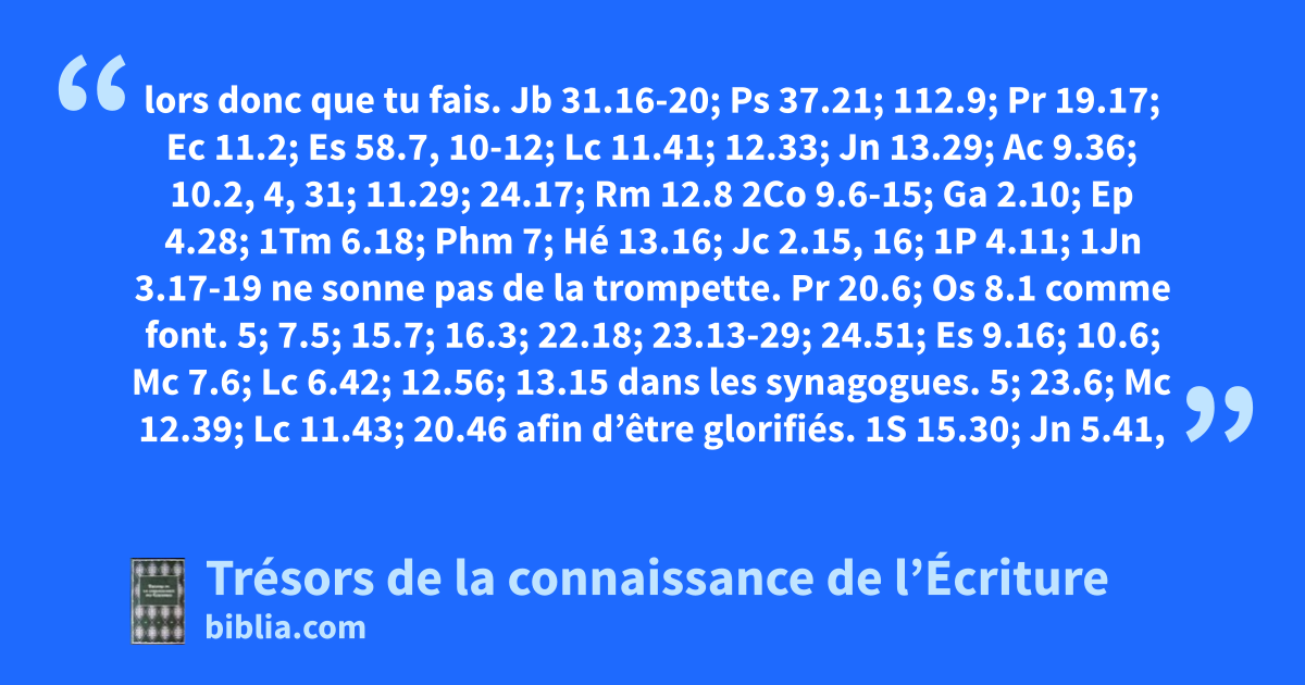 lors donc que tu fais. Jb 31.16-20; Ps 37.21; 112.9; Pr 19.17; Ec 11.2; Es 58.7, 10-12; Lc 11.41; 12.33; Jn 13.29; Ac 9.36; 10.2, 4, 31; 11.29; 24.17; Rm 12.8 2Co 9.6-15; Ga 2.10; Ep 4.28; 1Tm 6.18; Phm 7; Hé 13.16; Jc 2.15, 16; 1P 4.11; 1Jn 3.17-19 ne sonne pas de la trompette. Pr 20.6; Os 8.1 comme font. 5; 7.5; 15.7; 16.3; 22.18; 23.13-29; 24.51; Es 9.16; 10.6; Mc 7.6; Lc 6.42; 12.56; 13.15 dans les synagogues. 5; 23.6; Mc 12.39; Lc 11.43; 20.46 afin d’être glorifiés. 1S 15.30; Jn 5.41, 44; 7.18; 1Th 2.6 en vérité. 5, 16; 5.18