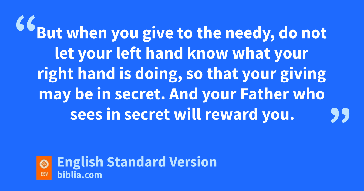 2 t“Thus, when you give to the needy, sound no trumpet before you, as the hypocrites do in the synagogues and in the streets, that they may ube praised by others. Truly, I say to you, they have vreceived their reward. 3 But when you give to the needy, do not let your left hand know what your right hand is doing, 4 so that your giving may be in secret. wAnd your Father who sees in secret will reward you.