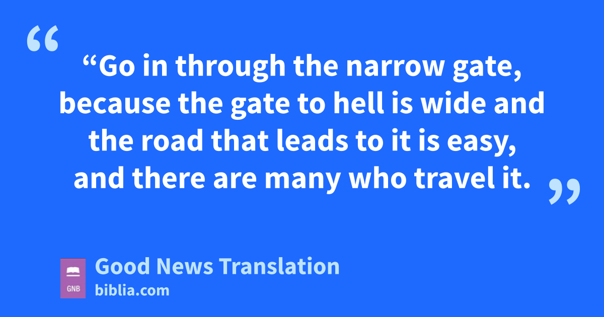 13 “Go in through the narrow gate, because the gate to hell is wide and the road that leads to it is easy, and there are many who travel it. 14But the gate to life is narrow and the way that leads to it is hard, and there are few people who find it.