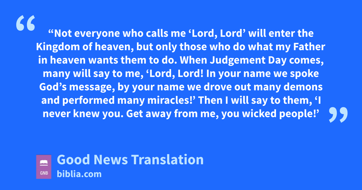 21 “Not everyone who calls me ‘Lord, Lord’ will enter the Kingdom of heaven, but only those who do what my Father in heaven wants them to do. 22When Judgement Day comes, many will say to me, ‘Lord, Lord! In your name we spoke God’s message, by your name we drove out many demons and performed many miracles!’ 23*Then I will say to them, ‘I never knew you. Get away from me, you wicked people!’