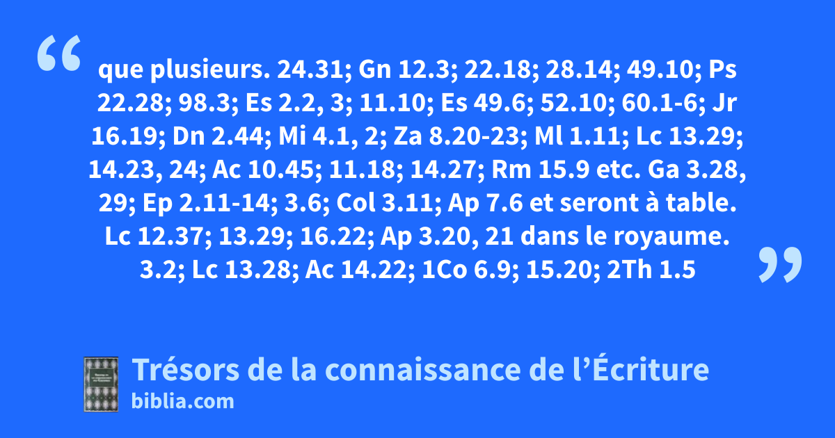 que plusieurs. 24.31; Gn 12.3; 22.18; 28.14; 49.10; Ps 22.28; 98.3; Es 2.2, 3; 11.10; Es 49.6; 52.10; 60.1-6; Jr 16.19; Dn 2.44; Mi 4.1, 2; Za 8.20-23; Ml 1.11; Lc 13.29; 14.23, 24; Ac 10.45; 11.18; 14.27; Rm 15.9 etc. Ga 3.28, 29; Ep 2.11-14; 3.6; Col 3.11; Ap 7.6 et seront à table. Lc 12.37; 13.29; 16.22; Ap 3.20, 21 dans le royaume. 3.2; Lc 13.28; Ac 14.22; 1Co 6.9; 15.20; 2Th 1.5