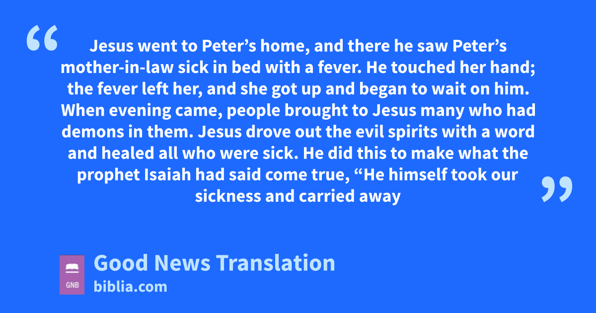 14 Jesus went to Peter’s home, and there he saw Peter’s mother-in-law sick in bed with a fever. 15He touched her hand; the fever left her, and she got up and began to wait on him.