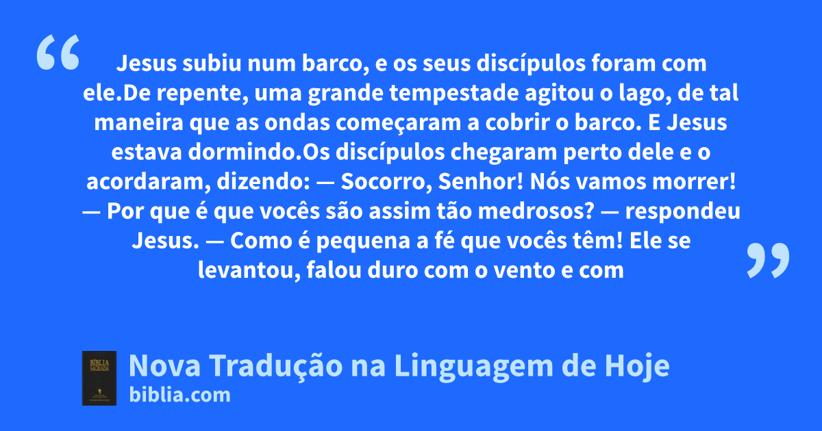 23 Jesus subiu num barco, e os seus discípulos foram com ele. 24 De repente, uma grande tempestade agitou o lago, de tal maneira que as ondas começaram a cobrir o barco. E Jesus estava dormindo. 25 Os discípulos chegaram perto dele e o acordaram, dizendo: