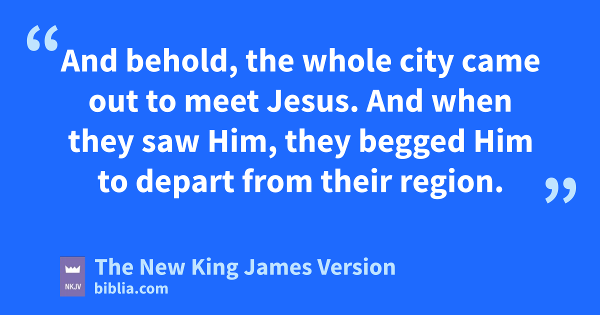 33 Then those who kept them fled; and they went away into the city and told everything, including what had happened to the demon-possessed men. 34 And behold, the whole city came out to meet Jesus. And when they saw Him, xthey begged Him to depart from their region.