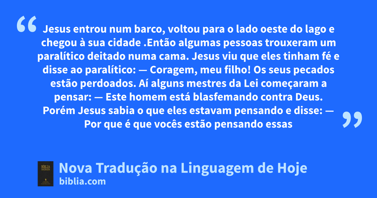 1 Jesus entrou num barco, voltou para o lado oeste do lago e chegou à sua cidadeh .2 Então algumas pessoas trouxeram um paralítico deitado numa cama. Jesus viu que eles tinham fé e disse ao paralítico: