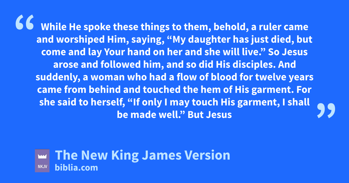 20 qAnd suddenly, a woman who had a flow of blood for twelve years came from behind and rtouched the hem of His garment. 21 For she said to herself, “If only I may touch His garment, I shall be made well.” 22 But Jesus turned around, and when He saw her He said, “Be of good cheer, daughter; syour faith has made you well.” And the woman was made well from that hour.