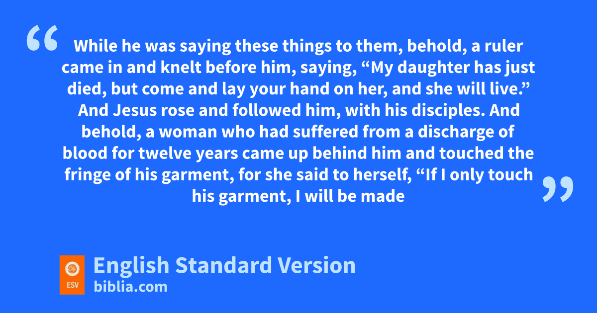 18 tWhile he was saying these things to them, behold, a ruler came in and uknelt before him, saying, “My daughter has just died, but come and lay your hand on her, and she will live.” 19 And Jesus rose and followed him, with his disciples. 20 And behold, a woman vwho had suffered from a discharge of blood for twelve years came up behind him and touched wthe fringe of his garment, 21 for she said to herself, “If I only touch his garment, I will be made well.” 22 Jesus turned, and seeing her he said, x“Take heart, daughter; your faith has made you well.” yAnd instantly4 the woman was made well. 23 And when Jesus came to the ruler’s house and saw zthe flute players and the crowd making a commotion, 24 he said, “Go away, for athe girl is not dead but bsleeping.” And they laughed at him. 25 But cwhen the crowd had been put outside, he went in and dtook her by the hand, and the girl arose. 26 And the report of this went through all that district.