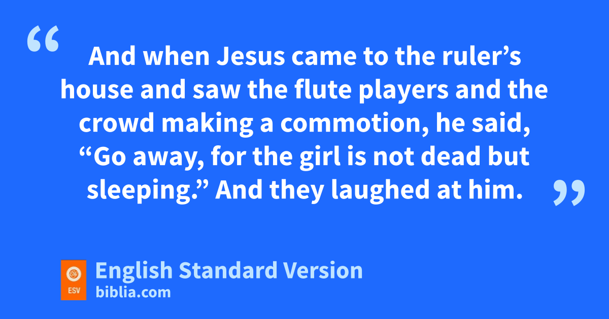 18 tWhile he was saying these things to them, behold, a ruler came in and uknelt before him, saying, “My daughter has just died, but come and lay your hand on her, and she will live.” 19 And Jesus rose and followed him, with his disciples. 20 And behold, a woman vwho had suffered from a discharge of blood for twelve years came up behind him and touched wthe fringe of his garment, 21 for she said to herself, “If I only touch his garment, I will be made well.” 22 Jesus turned, and seeing her he said, x“Take heart, daughter; your faith has made you well.” yAnd instantly4 the woman was made well. 23 And when Jesus came to the ruler’s house and saw zthe flute players and the crowd making a commotion, 24 he said, “Go away, for athe girl is not dead but bsleeping.” And they laughed at him. 25 But cwhen the crowd had been put outside, he went in and dtook her by the hand, and the girl arose. 26 And the report of this went through all that district.
